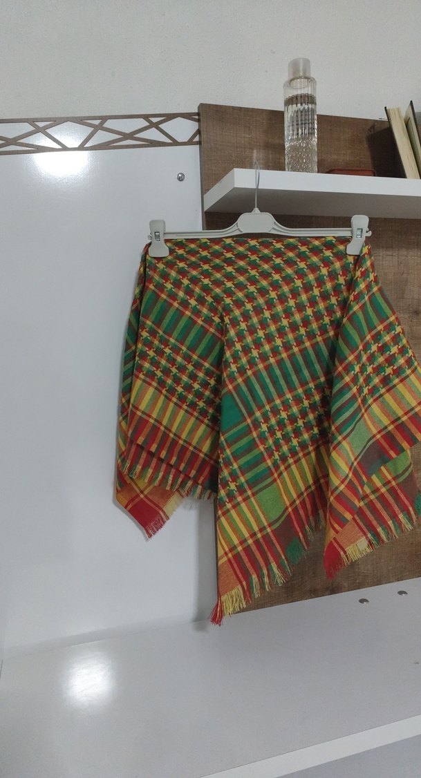 Renkli, bağlamalı kısa bohem ponço. Salaş kesim, askısız ve askılı detaylı, bağlamalı desenli günlük kullanıma uygun.