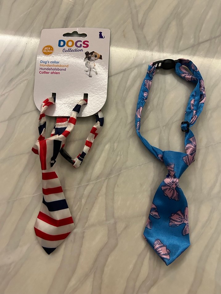 Sentetik kumaştan, bağlamalı, renkli tie-dye desenli çocuk kravatları. Kırmızı-beyaz-mavi çizgili ve mavi-pembe çiçek desenli modeller mevcuttur.