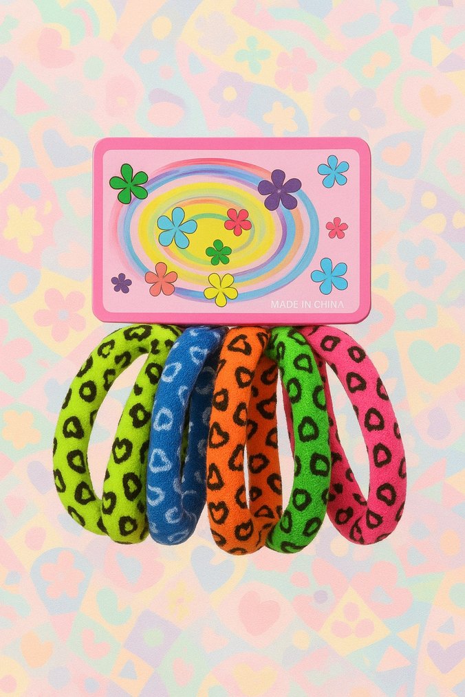 Çocuklar için elastik, renkli bağlamalı saç tokaları. Canlı tie-dye desenli ve leopar desenli farklı renklerde sunulmaktadır.