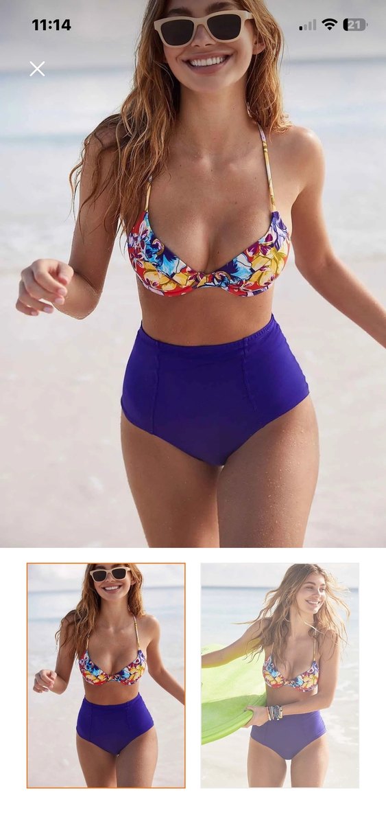 Renkli bağlamalı üst ve yüksek bel düz alt parçalı, kısa kesim, cesur ve şık plaj bikini takımı.