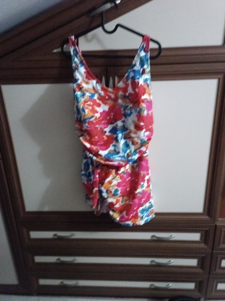 Renkli bağlamalı desenli, kolsuz ve vücuda oturan bohem tarz mayo. ayarlanabilir askıları ve göğüs pedi vardır etekli gibi durduğu için çok açık değildir
