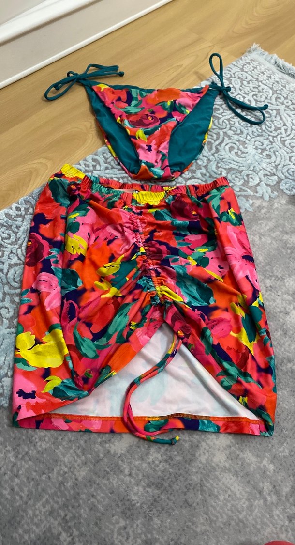 Renkli bağlamalı üst ve büzgülü, drapeli mini etekten oluşan mayo seti, dış mekan kullanımı için uygundur.