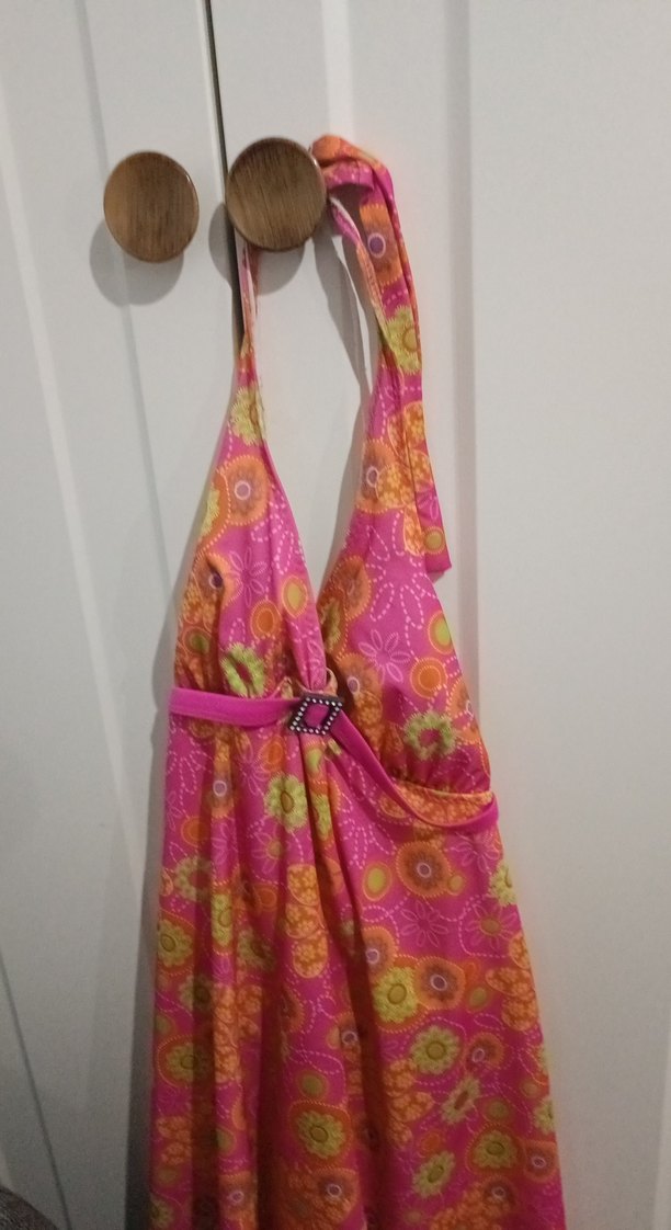 Pembe tabanlı, renkli çiçek desenli bağlamalı mayo ayarlanabilir boyun askısı ve toka detaylı.