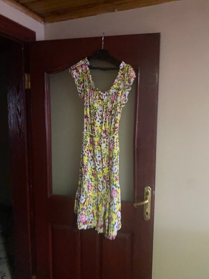 Bu renkli bohem elbise, askısız yakaya ve dökümlü, bol kesime sahiptir. Canlı batik desenlidir ve yumuşak sentetik kumaştan üretilmiştir.