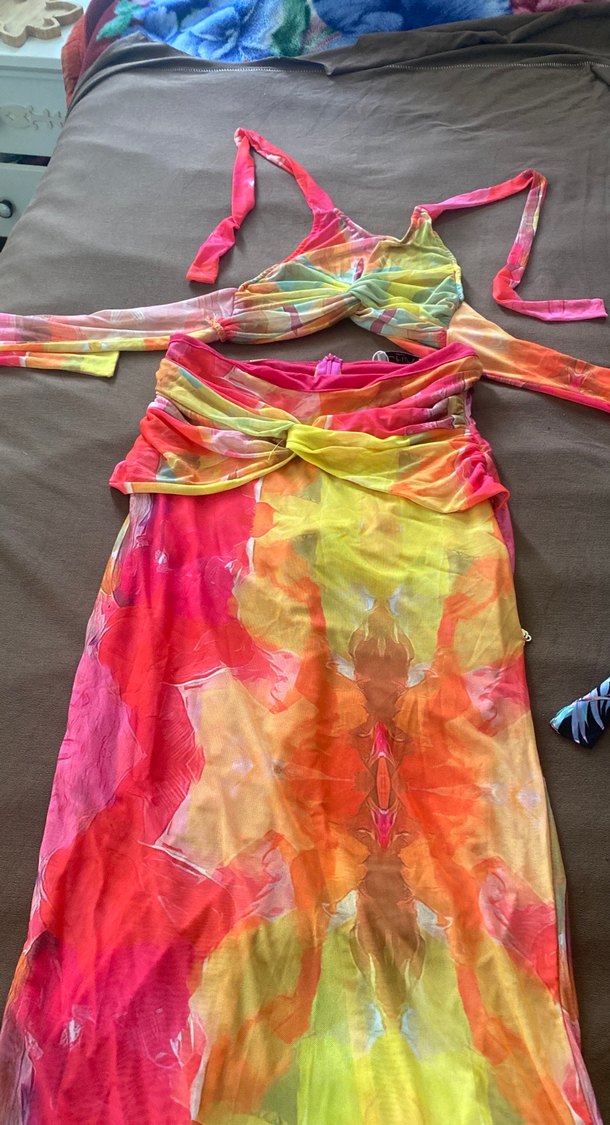 Renkli bağlamalı uzun elbise, drapeli detaylar ve ince askılarla, sentetik kumaştan üretilmiştir. Parti için uygundur.