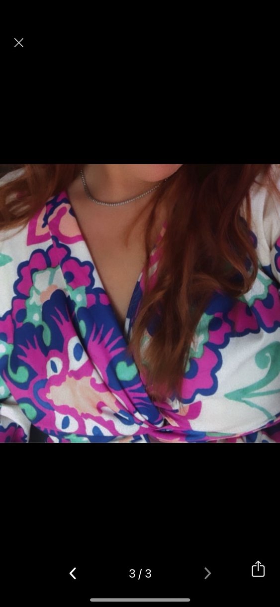 Renkli bağlamalı V yaka hamile bluzu, zincir detaylı ve askılı uzun kolludur. İpek gibi kumaştan, oturan kesim ve canlı batik desenlidir.