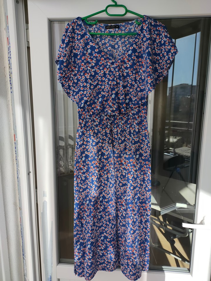 Renkli bağlamalı desenli, kısa kollu ve V yakalı uzun, bol kesim kadın elbisesi. Sentetik kumaştan, bohem tarzında günlük kullanıma uygun.