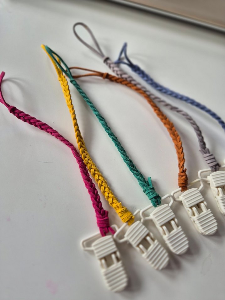 Renkli bağlamalı, uzun ve vücuda oturan örgü iplerden oluşan emzirme aksesuarları, beyaz klipslerle güvenli tutuş sağlar.
