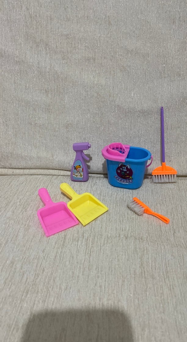 Renkli plaj ve bahçe temizlik oyuncak seti, hayal gücünü destekleyen küçük kova, süpürge, faraş, fırça ve sprey şişesi içerir.
