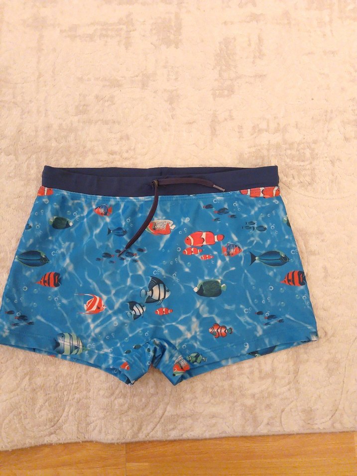 Renkli balık desenli, bağcıklı koyu renk bel bandına sahip mavi erkek çocuk mayo,çok az giyildi,defo sökük leke yoktur temizdir