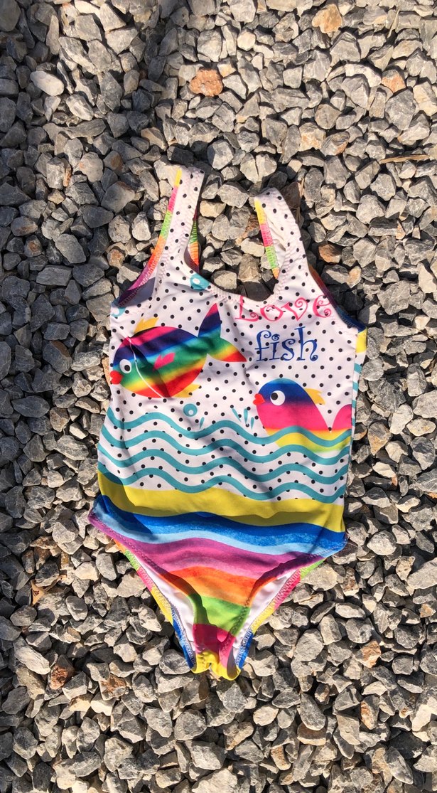 Renkli balık ve dalga desenleriyle kız çocuk mayo. Kolsuz ve plaj için uygun, pop kültür tarzında.
