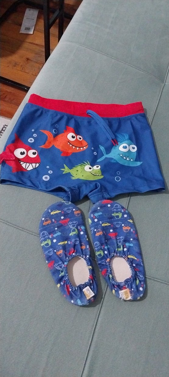 Renkli balık desenleri bulunan erkek çocuk mayo ve su ayakkabısı, rahat ve eğlenceli yüzme için uygundur. penti