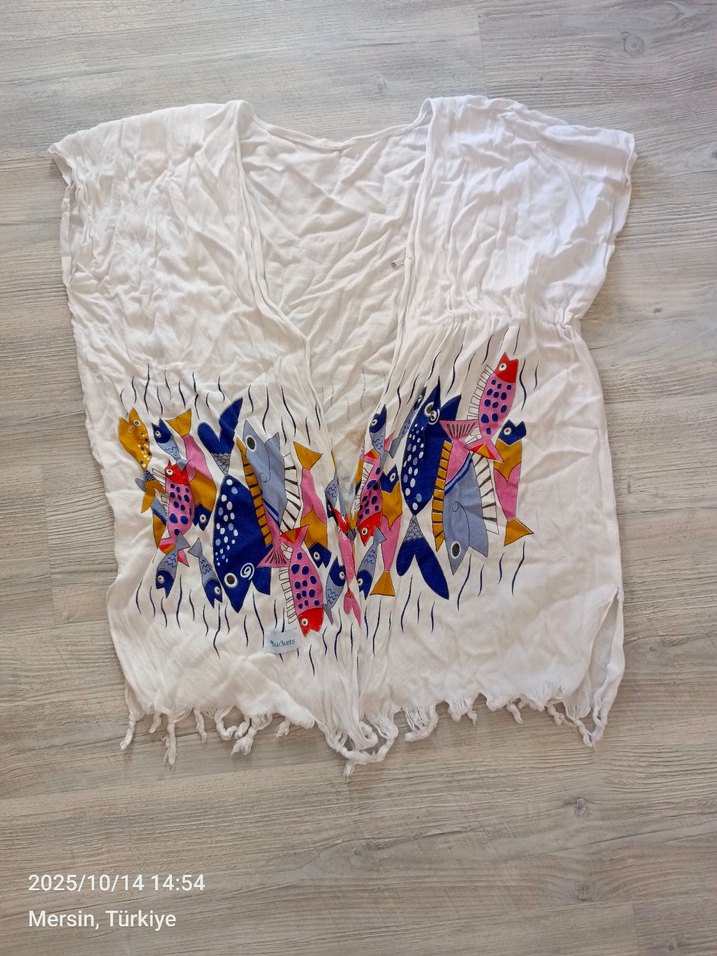 Renkli balık desenleriyle kısa, bol kesim, drapeli kadın pareo. Kısa kollu ve günlük kullanım için uygundur. sağ tarafın ipi çıkmış takıla bilir