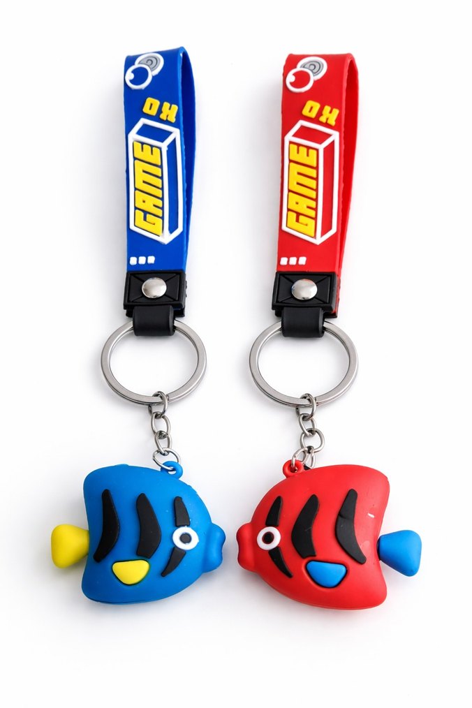 Renkli balık figürlü, püsküllü ve canlı pop kültür desenli anahtarlıklar. Her biri enerjik ve eğlenceli bir tarza sahip.