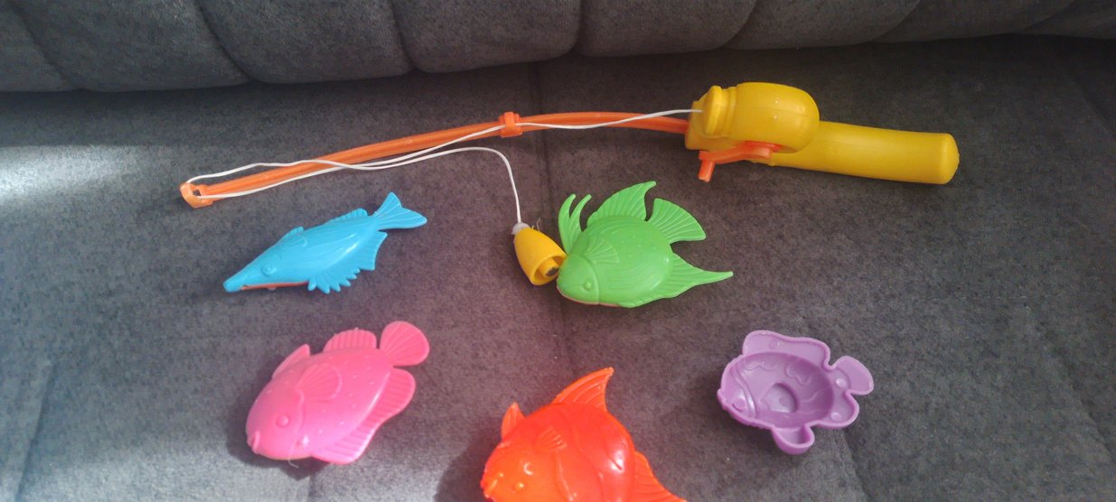 Canlı renklerde plastik balıklar ve oltadan oluşan eğlenceli bir balık tutma oyuncağı seti.