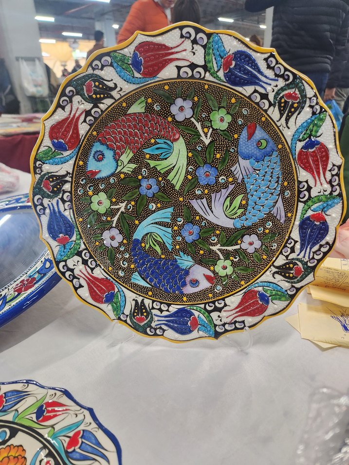 Renkli balık ve çiçek desenleriyle süslenmiş, kenarı dalgalı detaylı el yapımı 30 cm çini tabak.