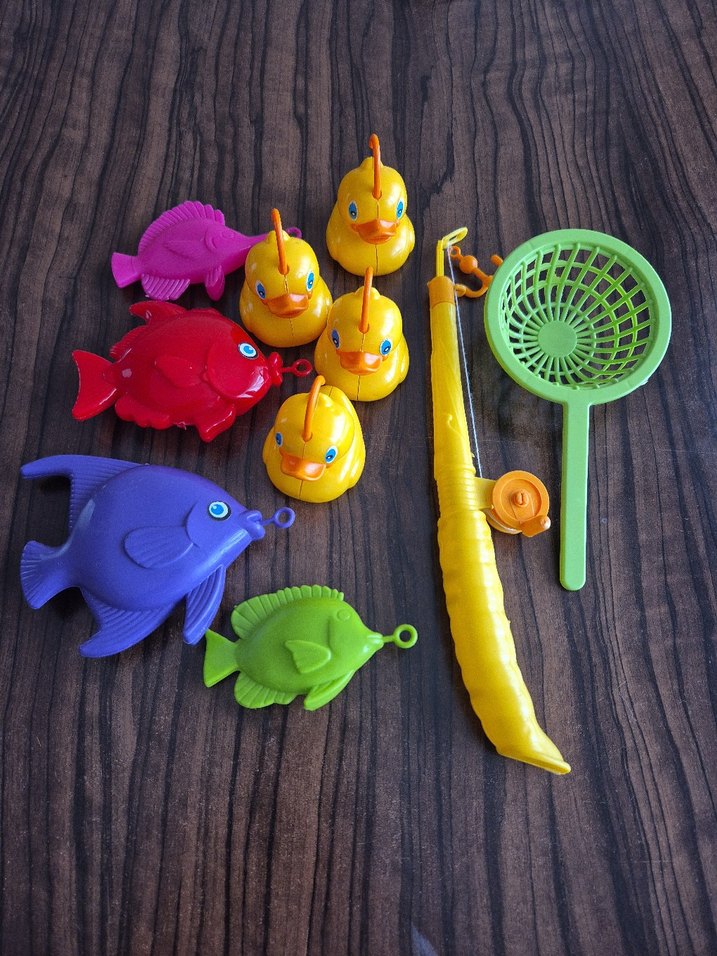 Çeşitli renklerde balıklar, dört sarı ördek figürü, sarı olta ve yeşil fileden oluşan renkli oyuncak seti. Kusurları var