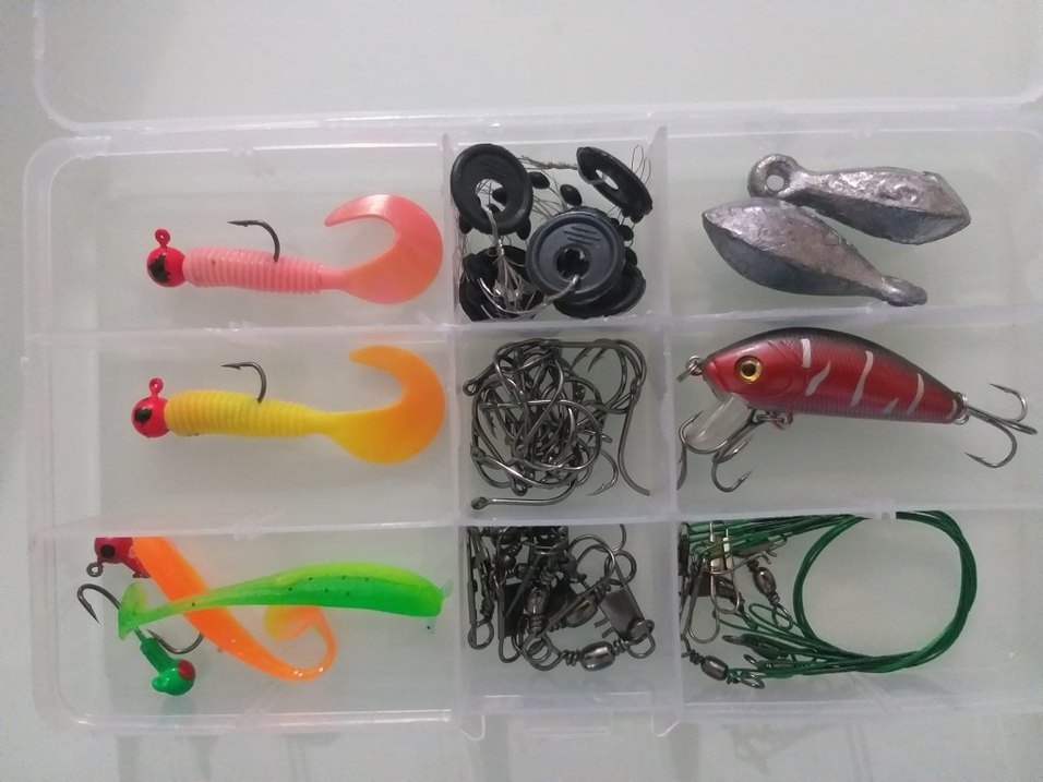 Çeşitli kanca, yem ve ağırlıklardan oluşan renkli balıkçılık kutusu.