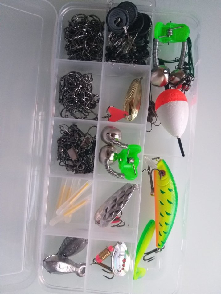 Çeşitli kanca, yem ve şamandıralardan oluşan renkli balıkçılık malzemeleri seti, şeffaf kutuda düzenlidir .