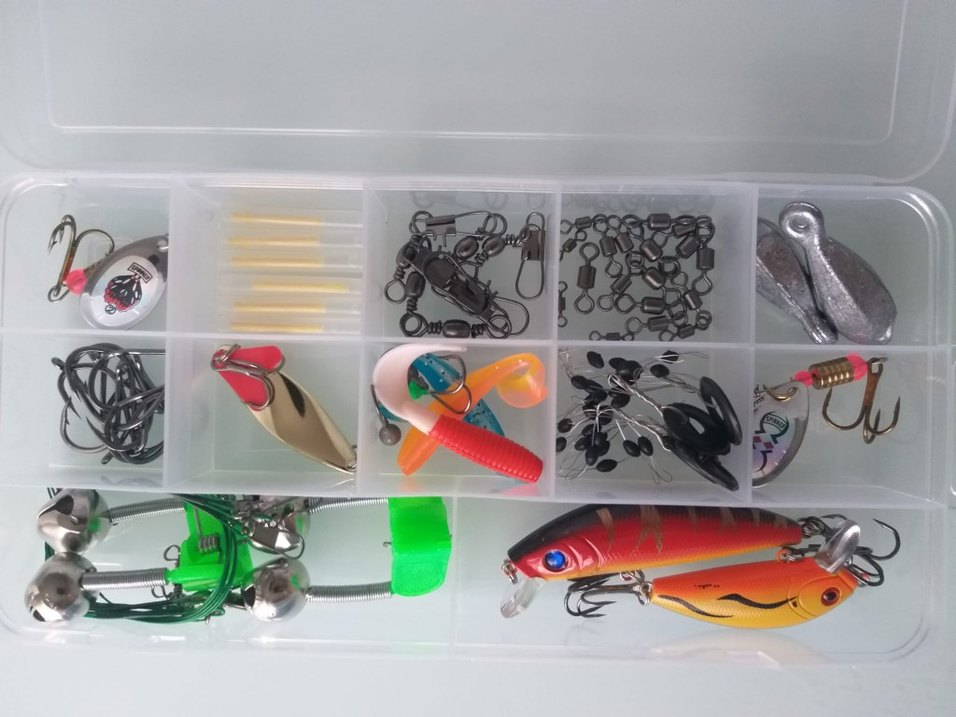 Çeşitli kanca, makara, yem ve yumuşak balıkçılık malzemelerinin bulunduğu renkli, bölmeli kutu içinde balıkçılık seti.