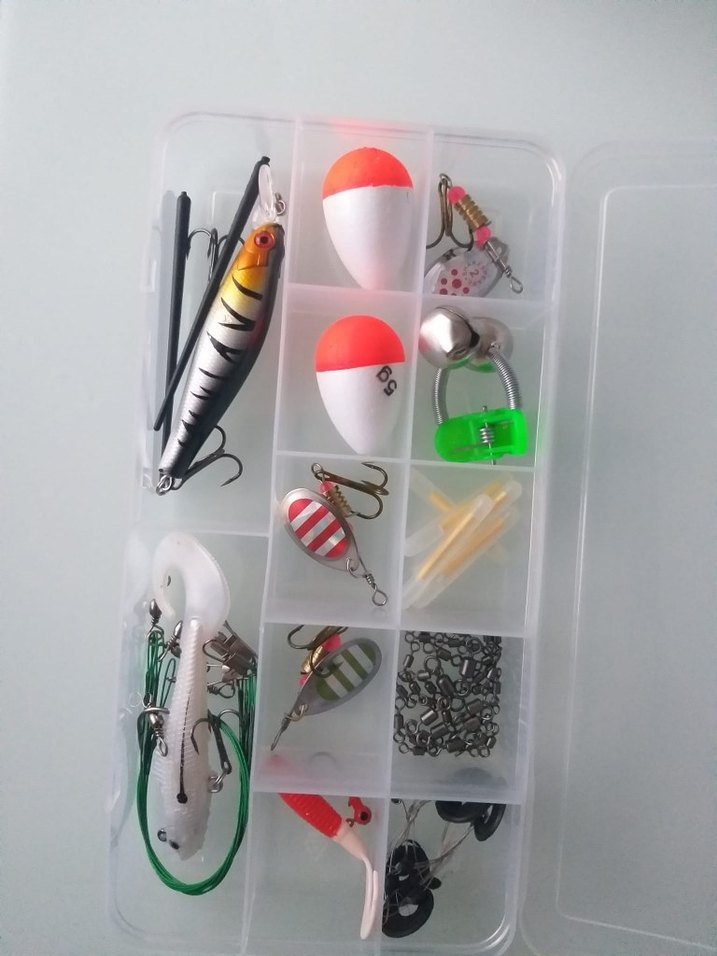 Çok bölmeli şeffaf kutuda çeşitli kanca, şamandıra ve yemlerin bulunduğu renkli balıkçılık malzemesi seti .