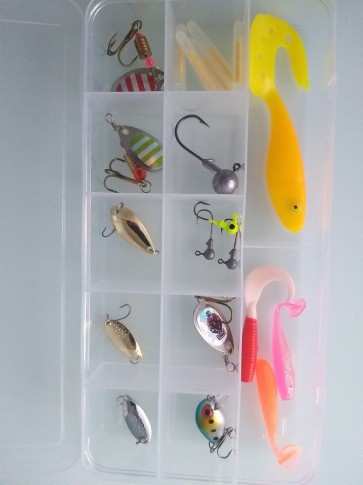 Çeşitli kanca ve yumuşak plastik yemlerden oluşan renkli balıkçılık yem seti, şeffaf plastik kutuda düzenlenmiştir.