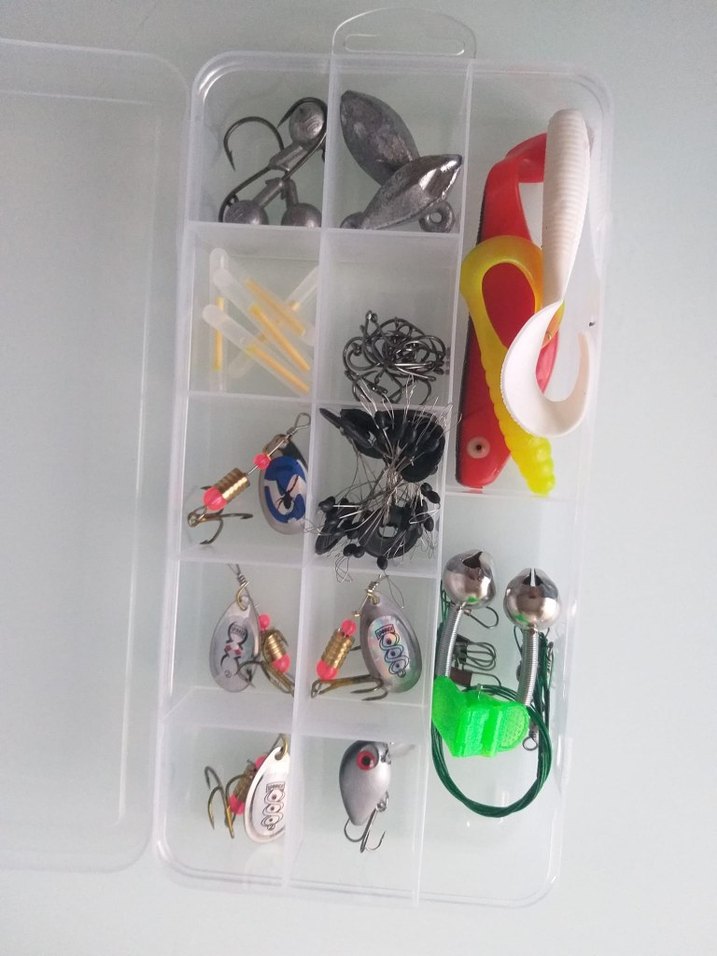 Çeşitli kanca, spinner ve yumuşak yemlerden oluşan renkli balıkçılık yem seti, şeffaf plastik kutuda düzenlenmiş.