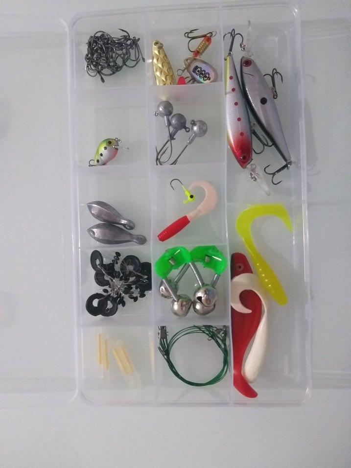 Çeşitli kanca, kaşık, yumuşak yem ve tellerden oluşan renkli balıkçılık yemleri ve aksesuarları seti, şeffaf kutuda düzenlenmiştir.