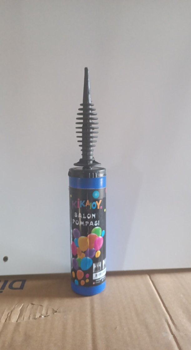 Uzun uçlu, renkli balon pompası. Gövdesinde çeşitli balon çizimleri bulunur.