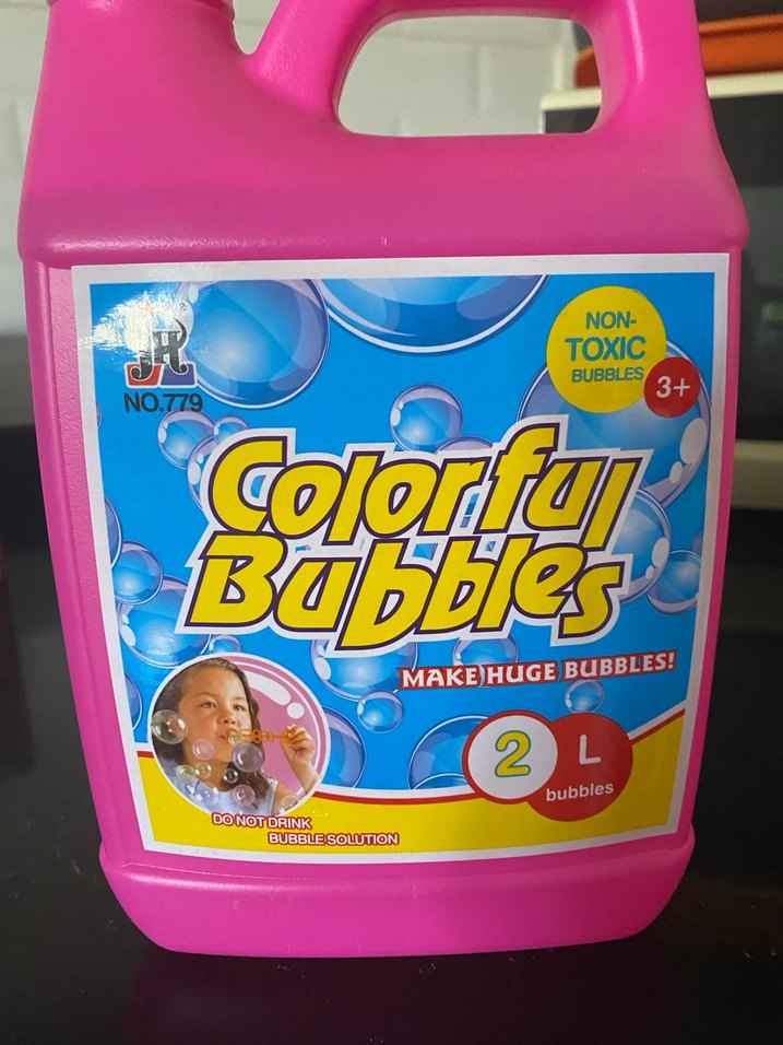 3 yaş ve üzeri çocuklar için 2 litrelik renklı, toksik olmayan baloncuk sıvısıdır. Büyük baloncuklar yapar. (26 euro fiyati normalde)