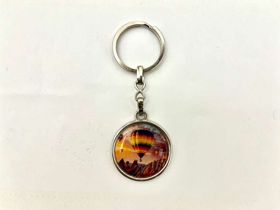 Renkli ve zincir detaylı bu anahtarlık, yuvarlak balonlu figürle bohem tarzını yansıtıyor.