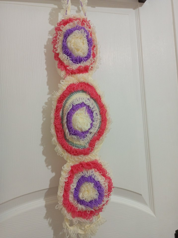 Yumuşak dokulu, üç renkli banyo süngerinden oluşan set, kolay saklama için ip ile bağlıdır. el emeğidir