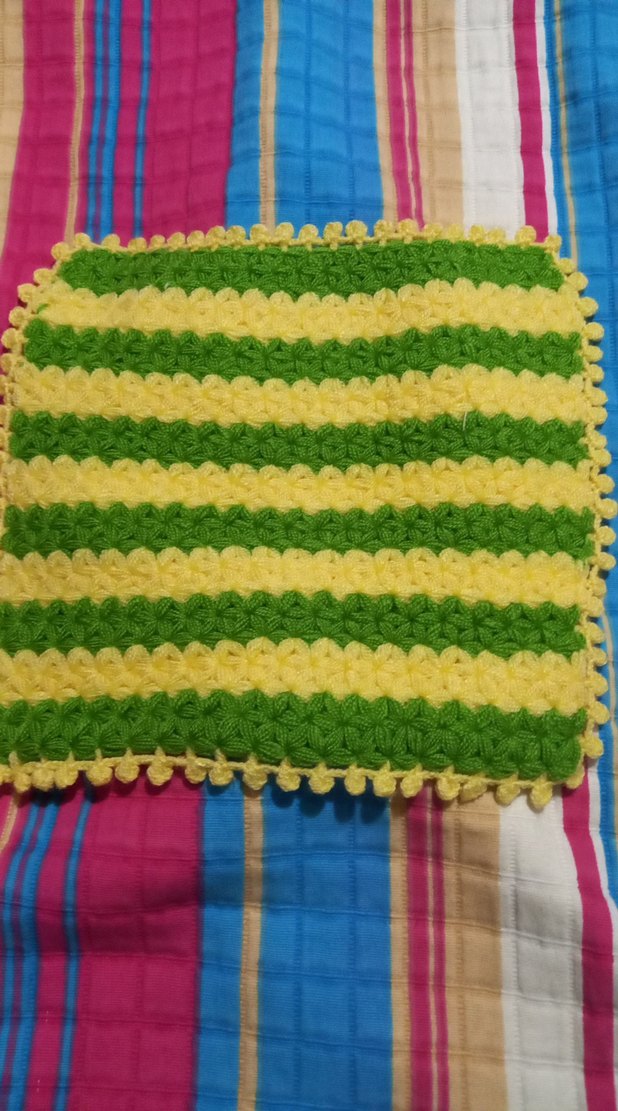 Yeşil ve sarı renklerde, dokulu yüzeye sahip renkli banyo süngeri.