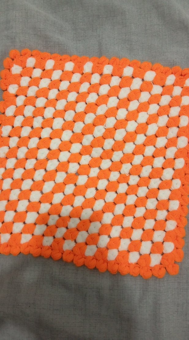 Turuncu ve beyaz renklerde dokulu, renkli banyo süngeri. Yumuşak ve banyo için uygun. el emeği