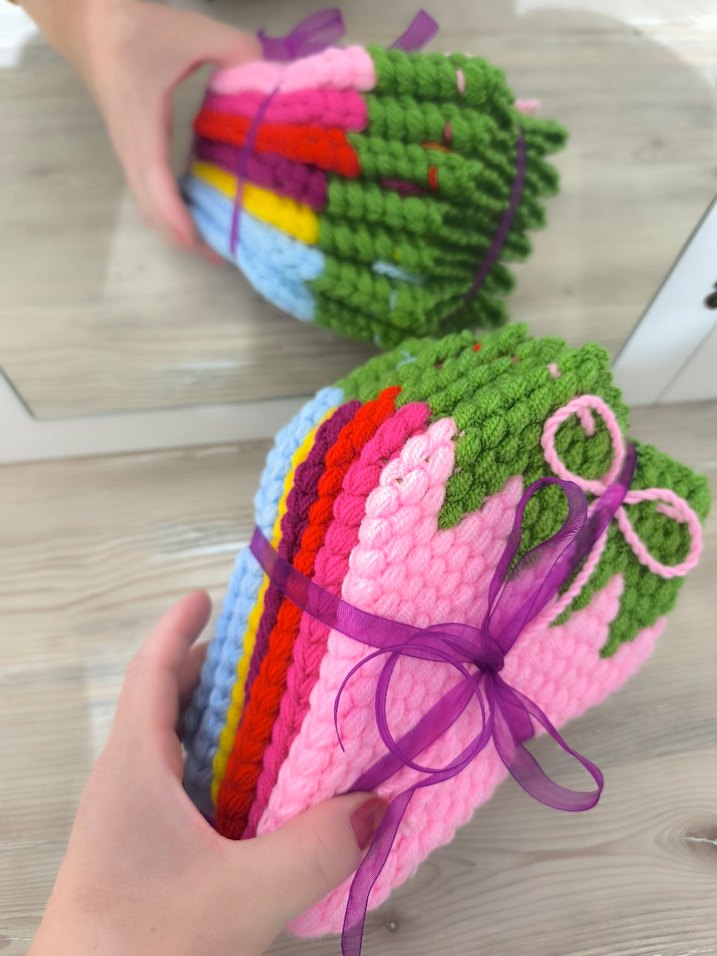 Mor kurdele ile bağlanmış, dokulu yüzeye sahip renkli banyo süngerleri. Yumuşak ve kullanışlıdır.