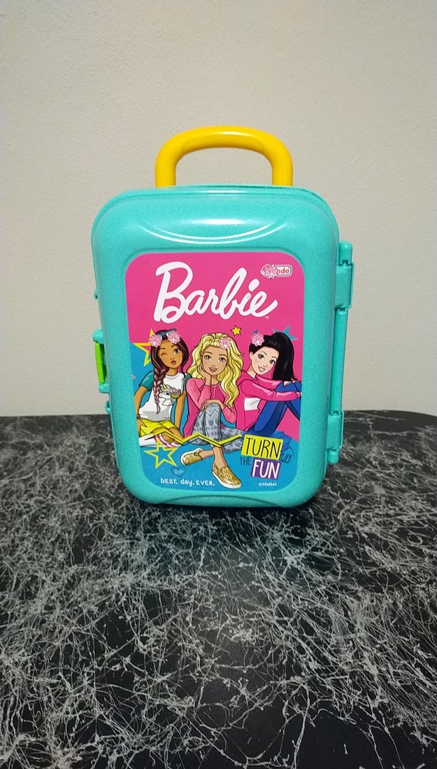 Mavi gövde ve sarı saplı, önünde Barbie figürleri ve "TURN FUN" yazısı bulunan renkli Barbie bavul