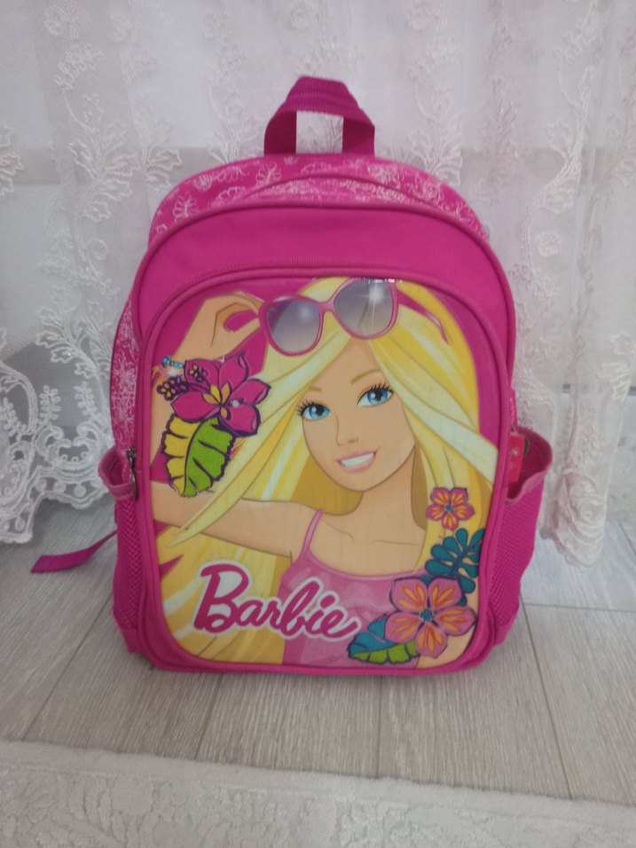 Renkli Barbie desenli pembe çocuk sırt çantası. Geniş ana bölme ve yan ceplere sahip. Üstten tutma sapı ve ayarlanabilir askılar bulunur.