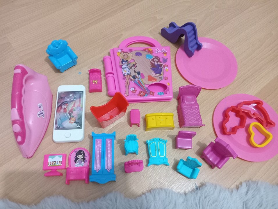 Çeşitli küçük mobilya parçaları ve Barbie figürlü pembe kitap içeren renkli Barbie mini oyun seti. Oyuncak telefon ve küçük mor kaydırak da bulunur.