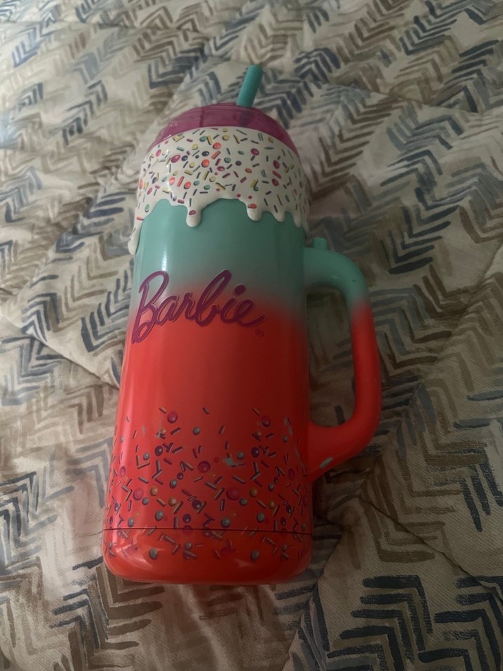 Renkli Barbie temalı, kulplu ve kapaklı kupa. Üst kısmında serpilmiş şekerlemeler deseni ve pipeti bulunur. Ufak eksıklerı var ınternet resmını sona ekledım ordan bakabılırsınız kınetık kumu yok bence gerekte yok:))