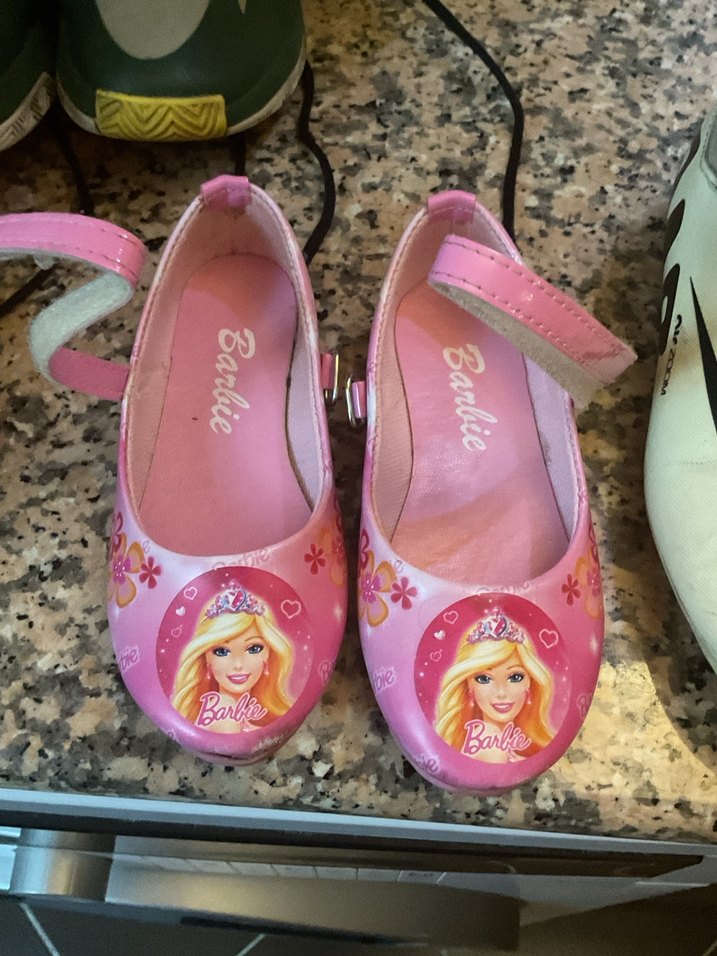 Renkli baskılı pembe kız babet ayakkabı, tokalı kayış ve kauçuk tabanlıdır, Barbie figürlü, trend sokak stili için uygundur.