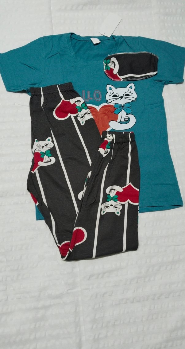 Renkli baskılı, kısa kollu ve bisiklet yaka bayan pijama takımı. Uzun paça ve ince kesimli, konforlu örme kumaştan üretilmiştir. Hiç giyilmedi etiketli