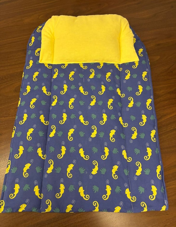 Çocuklar için renkli baskılı, sarı denizatı desenli ve yumuşak sarı yastıklı, sıcak ve yumuşak kumaştan yapılmış uyku tulumu.