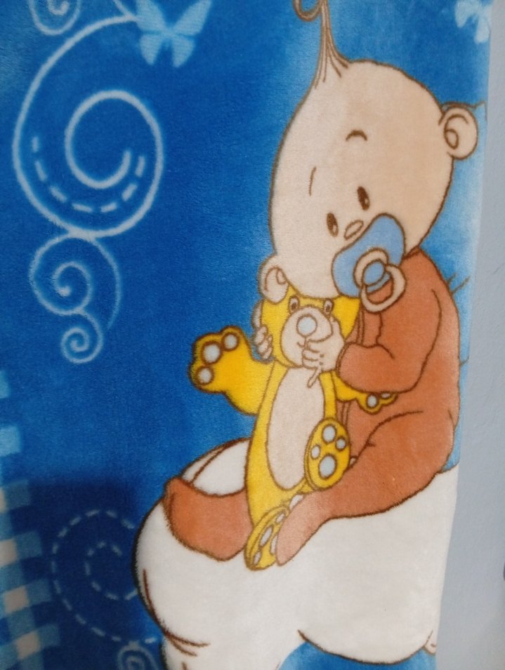 Yumuşak ve sıcak kumaştan yapılmış, mavi tonlarda renkli baskılı çocuk battaniyesi.