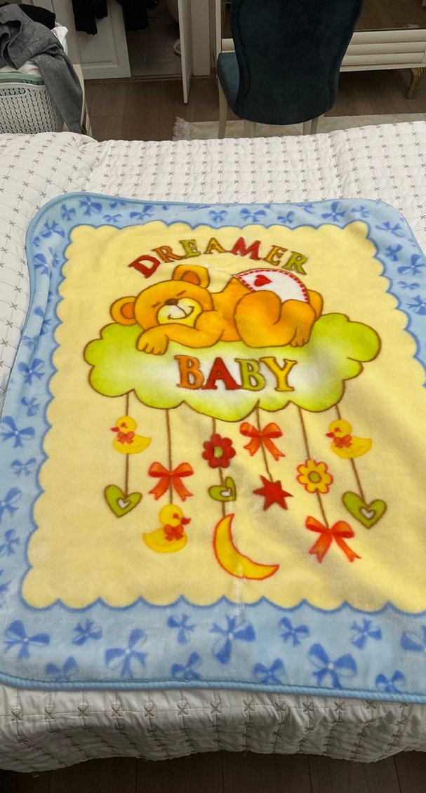 Yumuşak ve sıcak kumaştan, ayıcık ve "BABY" yazılı renkli baskılı bebek battaniyesi.