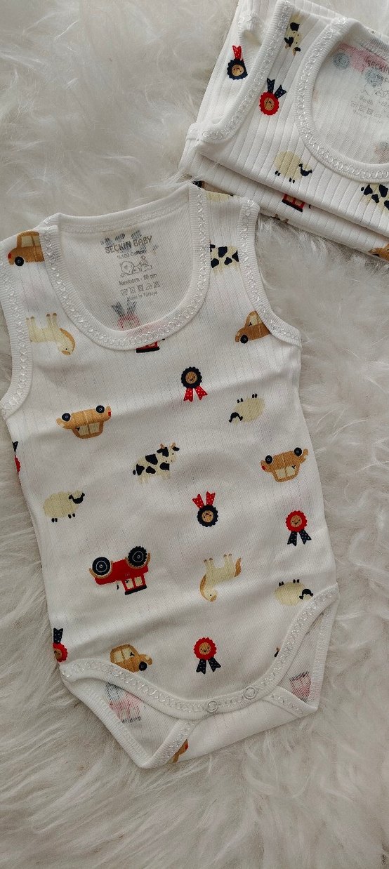Pamuklu, kolsuz, yuvarlak yakalı bebek body. Renkli baskılar ve dantel süslemeleriyle dikkat çeker. yenidoğan 3-6-9 ay mevcut