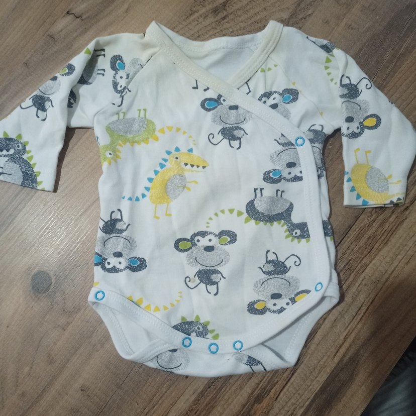Renkli baskılı, uzun kollu bebek erkek body. Düğmeli ve yuvarlak yakalı, yumuşak sentetik kumaştan yapılmıştır.