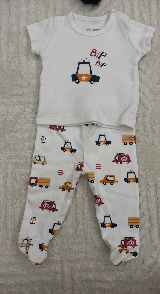 Yumuşak kumaştan yapılmış, renkli baskılı kısa kollu ve yuvarlak yakalı bebek erkek takımı. Takımda tokalı detaylar bulunur. Sadece 1 kere giydi.