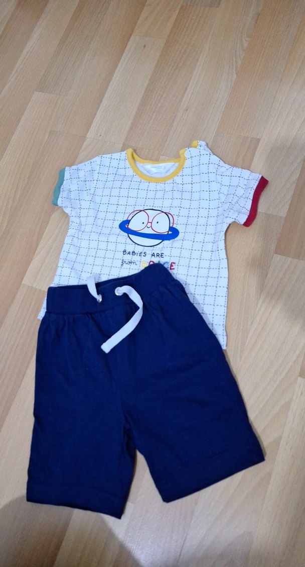 Pamuk kumaştan, kısa kollu, renkli baskılı ve yuvarlak yakalı üst ile rahat mavi şortlardan oluşan bebek erkek takımı.