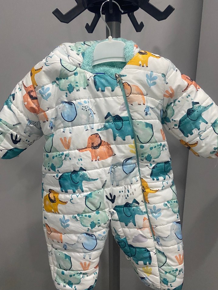 Renkli desenli, yumuşak ve sıcak kumaştan yapılmış, kürk detaylı bebek erkek tulumu. Sokak stili için uygundur. ❄️