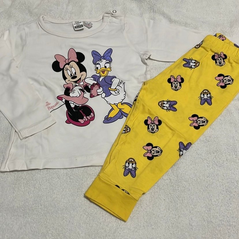 Uzun kollu beyaz üstte Minnie ve Daisy baskıları, sarı pantolonda karakter desenleri vardır. Hediye gelmişti bedeni çok uymadı çok fazla giyilmedi o yüzden. Kolunda minik bir leke var beklediği için mi bilmiyorum fotoğrafladım.